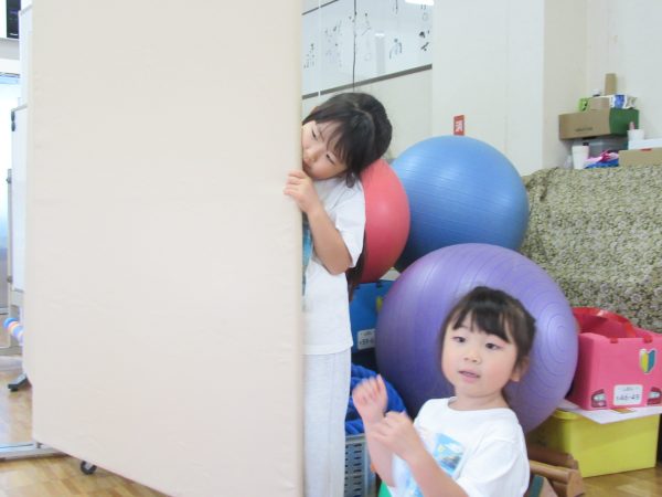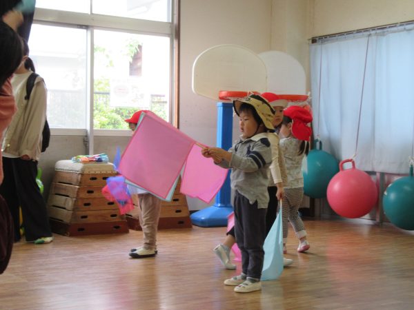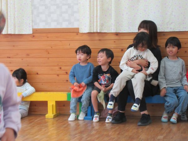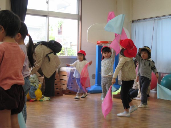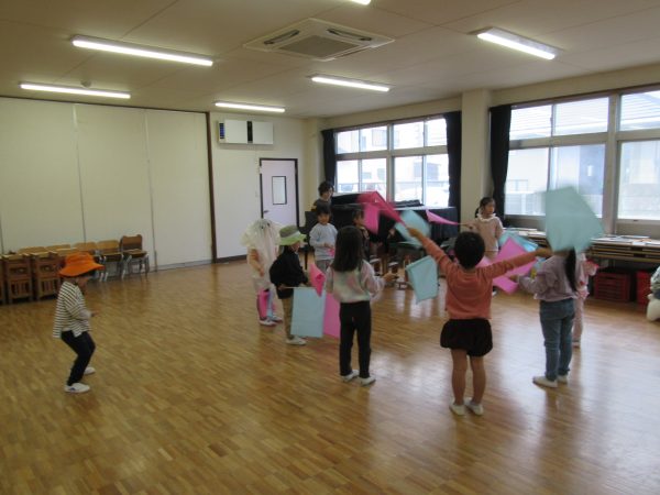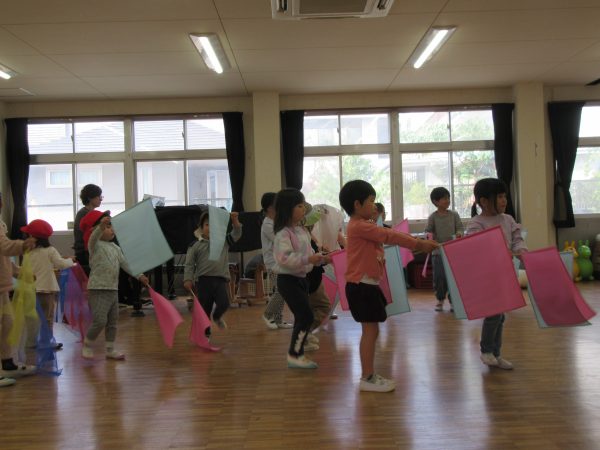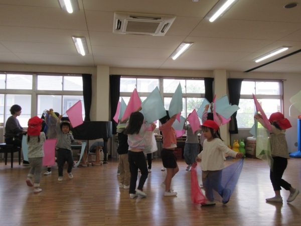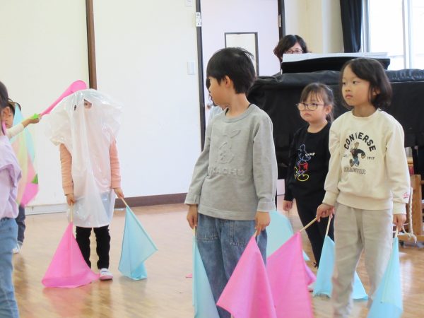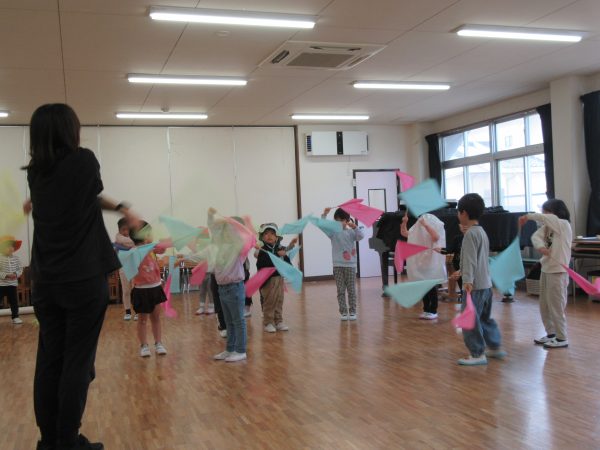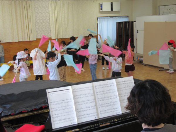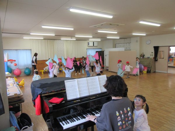 年長組が踊った「プレゼント」の曲を依田先生が弾いています。なんだろうとホールに子どもたちが集まります。音色を楽しむ子、旗を持って踊る子、足でリズムをとって楽しむ子、ハロウィンのおばけ姿で踊る子、先生のピアノのそばに寄り添う子・・・その姿は様々です。