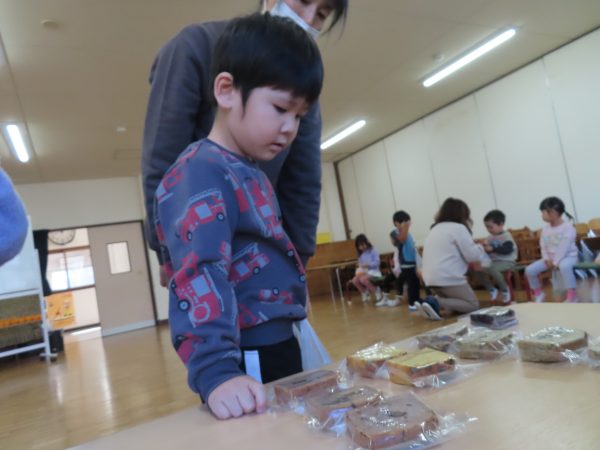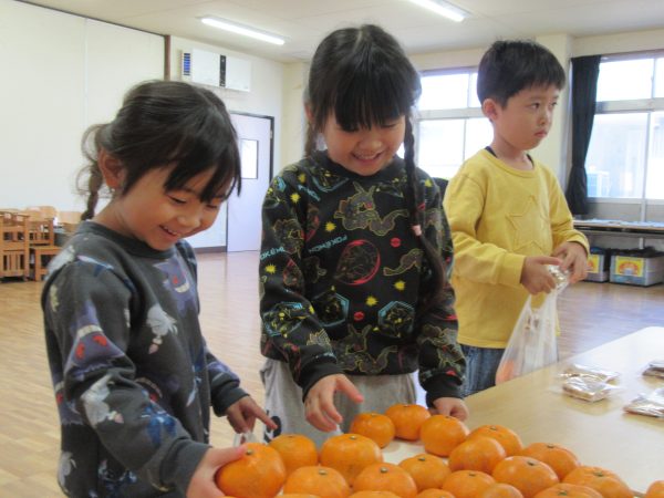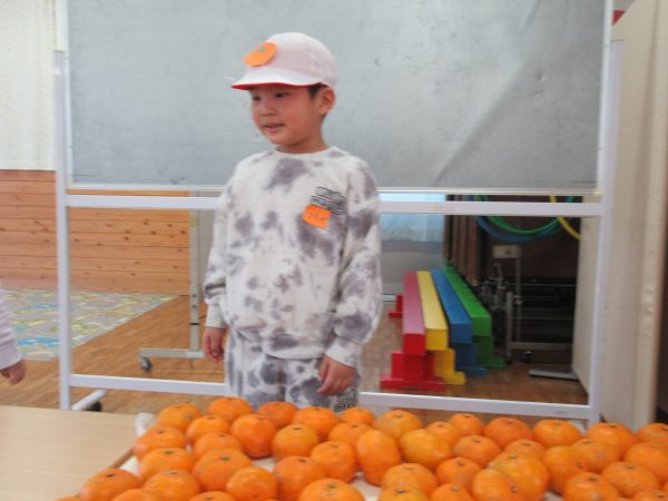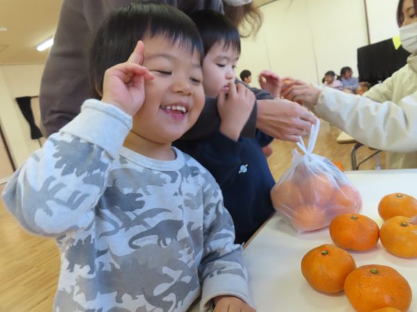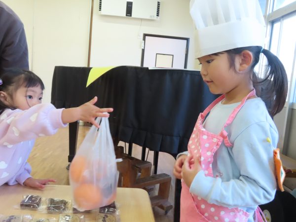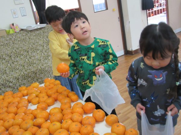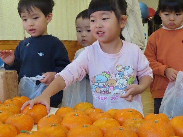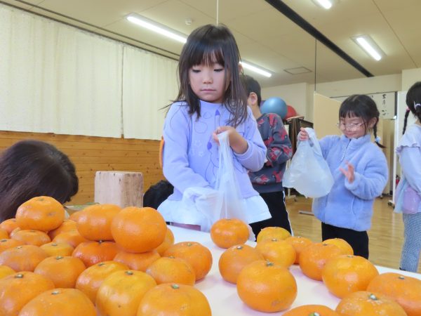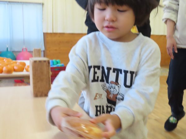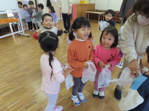 2025.11.20〈みかんとおかし屋さん〉今日は、ミニバザーで販売する予定だった、みかんとお菓子を子どもたちが、お買い物ごっこで買いました。積み木をキャッシュレスリーダーに見立てて「ペイペイ」と言ってタッチ。たくさんのみかんとおいしそうなお菓子をよく吟味しながら袋に入れていました。今日お休みしたお友だちは、連休明けにやろうね!!