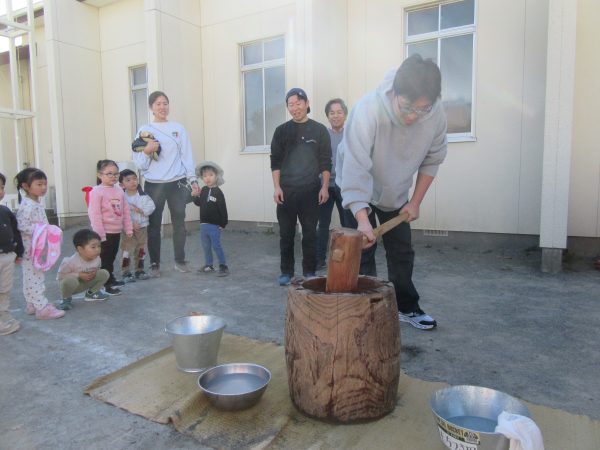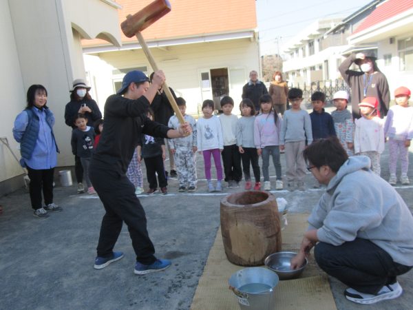 2026.1.16〈おもちつき〉今日は風もおさまり、寒さも和らいだ中、楽しみにしていたおもちつきが行われました。もち米がふかされるにおいにわくわく感は高まるばかりの子どもたち!楽しくおもちつきの体験ができ、心もお腹もほくほくの一日でした。お手伝いして下さった保護者の皆様も楽しそうな様子で嬉しく思いました。ありがとうございました。