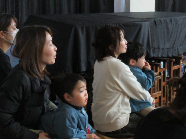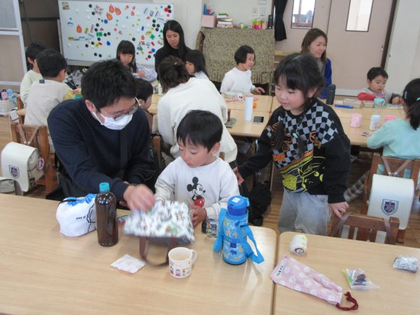 今日はお弁当を持って、1日入園。おうちの人と一緒に人形劇を見たり、お外でたくさん遊んだり、お弁当も一緒に食べたね。